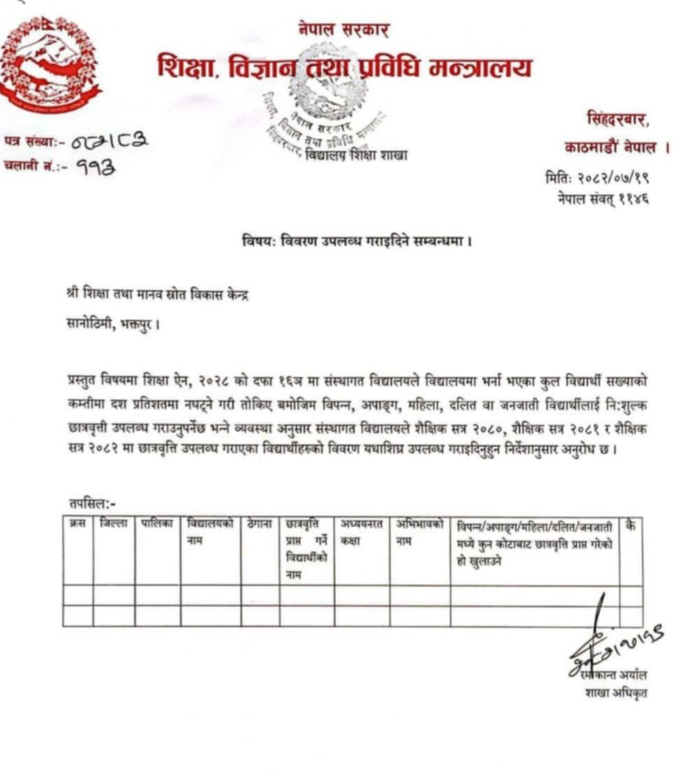 मन्त्रालयले सानोठिमीस्थित शिक्षा तथा मानव स्रोत विकास केन्द्रलाई पत्र काट्दै शैक्षिक सत्र २०८०, २०८१ र २०८२ मा कुन कुन विद्यालयहरुले के कति छात्रवृति दिएका हुन त्यसको विवरण उपलब्ध गराउन आग्रह गरेको छ ।