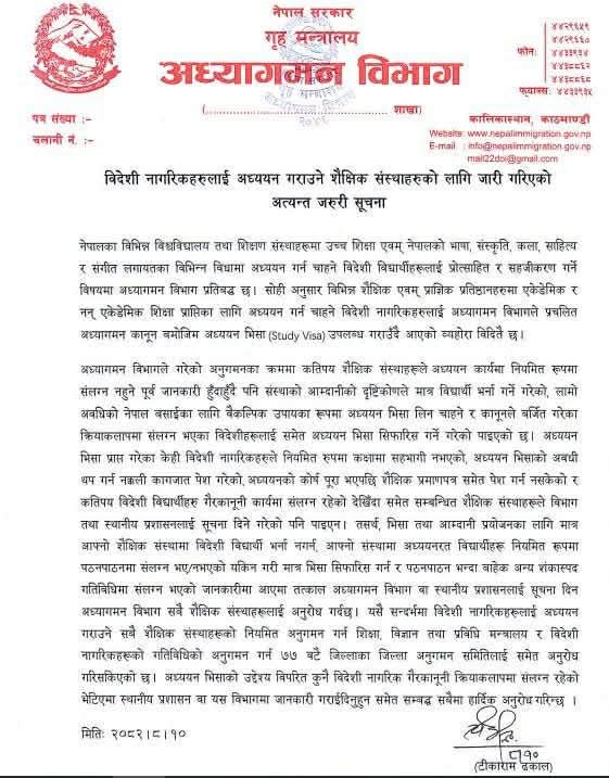 यसैबीच अध्यागमन विभागले शैक्षिक संस्थाहरुलाई त्यस्ता व्यक्तिहरूलाई अध्ययन भिसाका लागि सिफारिस नगर्न निर्देशन पनि जारी गरेको छ । उक्त निर्देशनमा केही विदेशी नागरिक गैरकानूनी गतिविधिमा समेत संलग्न पाइएपछि त्यसको सूचना प्रहरी तथा स्थानीय निकायहरूमा दिन समेत उल्लेख गरिएको छ ।