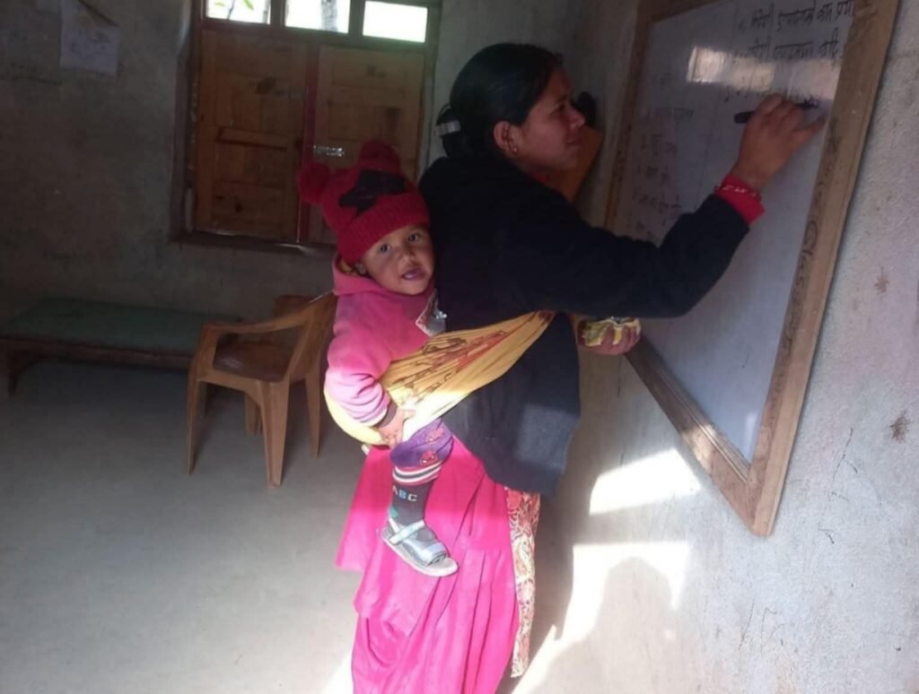 बच्चा बोकेर कक्षामा, समर्पणको पाठ पढाउँदै शिक्षिका