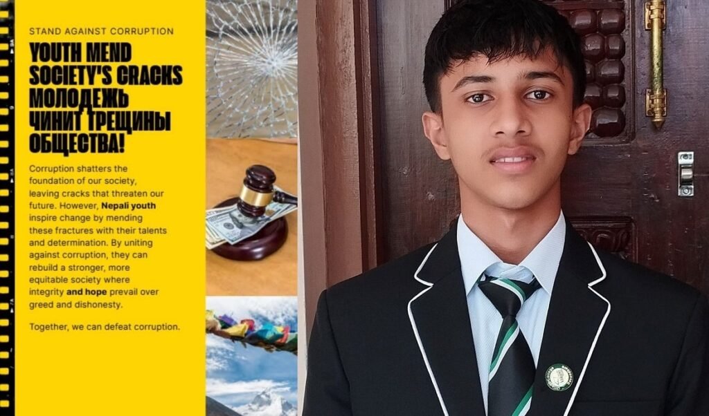 काठमाडौँ । भ्रष्टाचारविरुद्धको सशक्त सन्देशलाई कलात्मक अभिव्यक्तिमा उतार्दै नेपालका १५ वर्षीय विद्यार्थी अनुराग पंगेनीले अन्तर्राष्ट्रिय स्तरमा देशको नाम उज्यालो पारेका छन् । सन् २०२५ का लागि आयोजित भ्रष्टाचारविरोधी सामाजिक विज्ञापनसम्बन्धी अन्तर्राष्ट्रिय युवा प्रतियोगितामा उनले तेस्रो स्थान हासिल गरेका हुन् ।